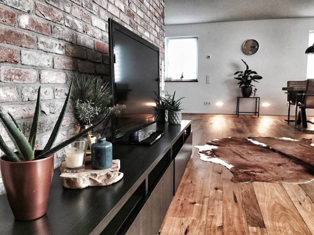 Кирпич предоставляет большие возможности для обустройства — он отлично смотрится с модным в настоящее время бетоном, а также с деревом. Натуральные материалы или их имитации прекрасно гармонируют с «сырым характером» кирпича.