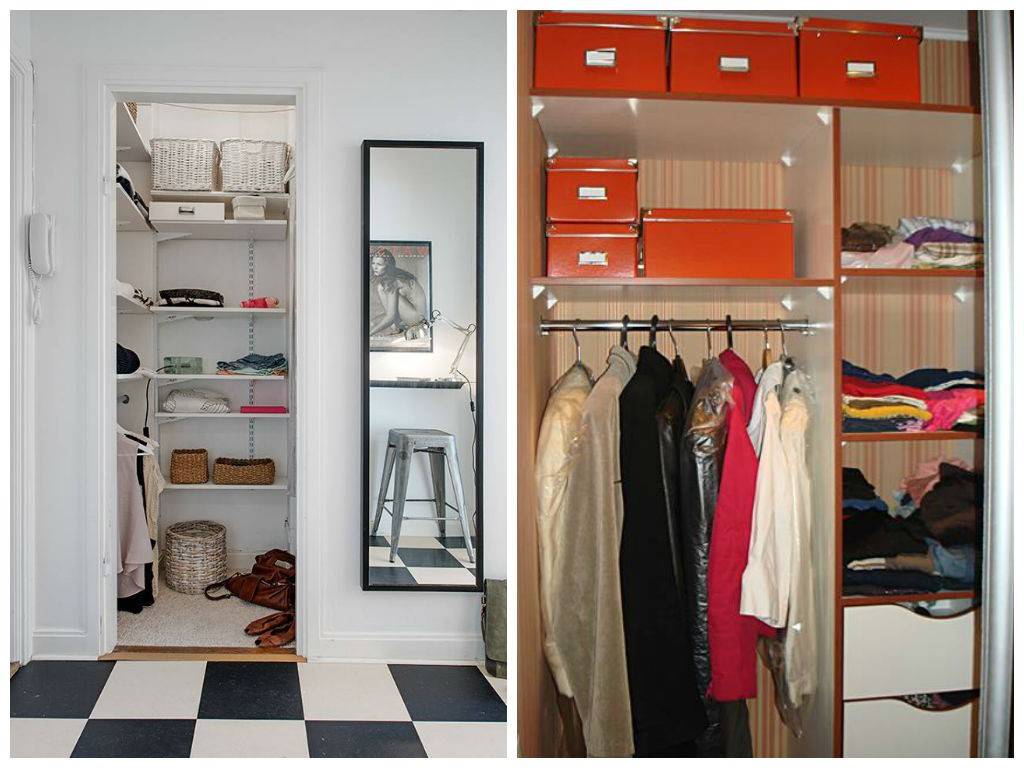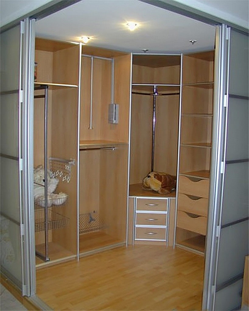 Как вариант можно рассмотреть угловую гардеробную. А закрыв раздвижными дверями нишу, и заполнив ее полками, можно получить замечательный вариант стеллажа или кладовой. Это будет прекрасным способов взглянуть по-новому на старое пространство.