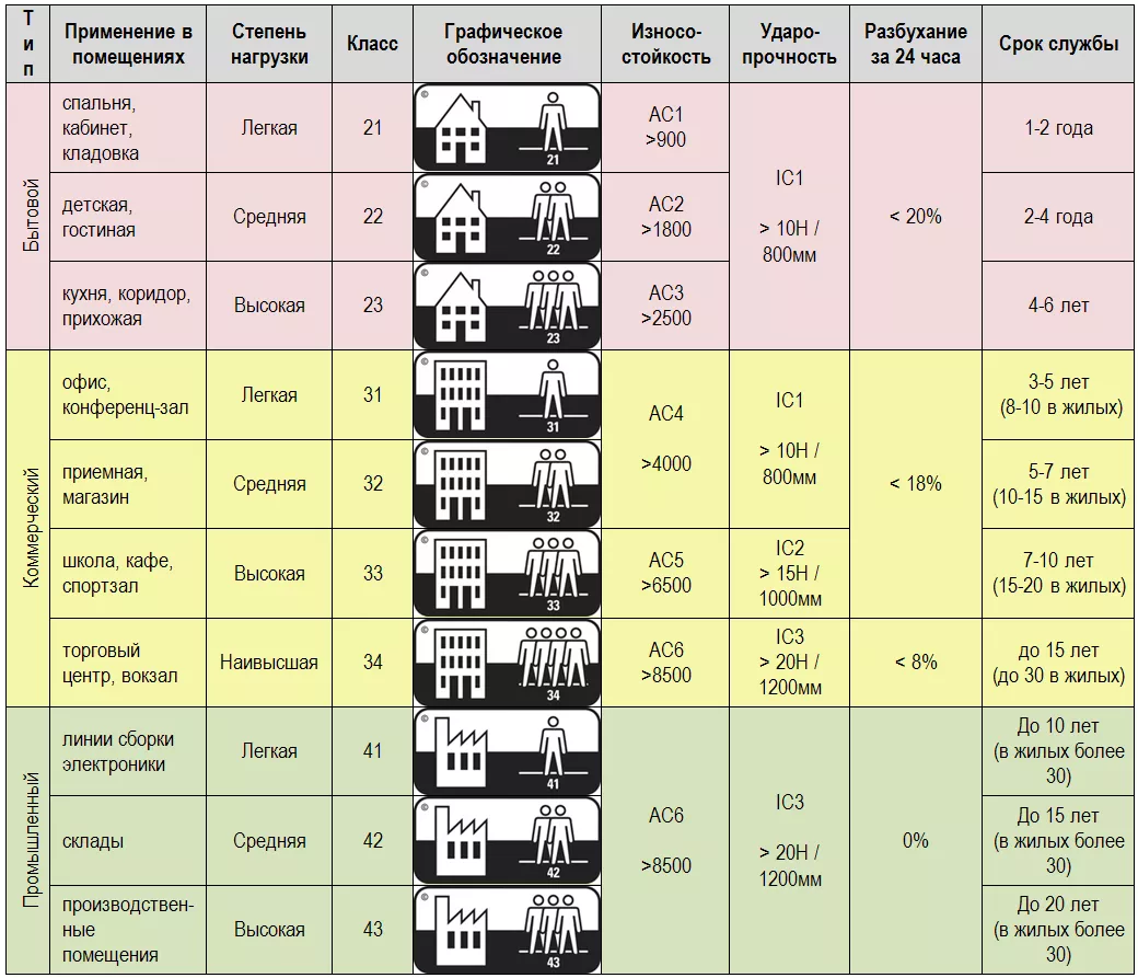 Ниже приведена сводная таблица базовых характеристик ламината с разными классами эксплуатации: