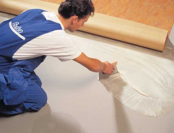 Для приклеивания линолеума, ковролина клей надо наносить только на пол. Шпателем выполняется тонкий клеевой слой (до 3 см), затем укладывается напольное покрытие, заранее подготовленное и расправленное, вырезанное по размеру помещения. Материал нужно хорошо прижимать к полу, прокатывая валиком буквально каждый сантиметр.