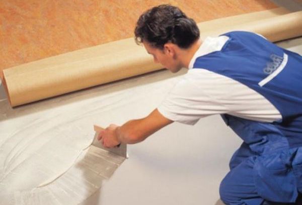 - При поклейке ковролина или линолеума клеевая смесь шпателем наносится на пол. Затем на него постепенно укладывается покрытие.