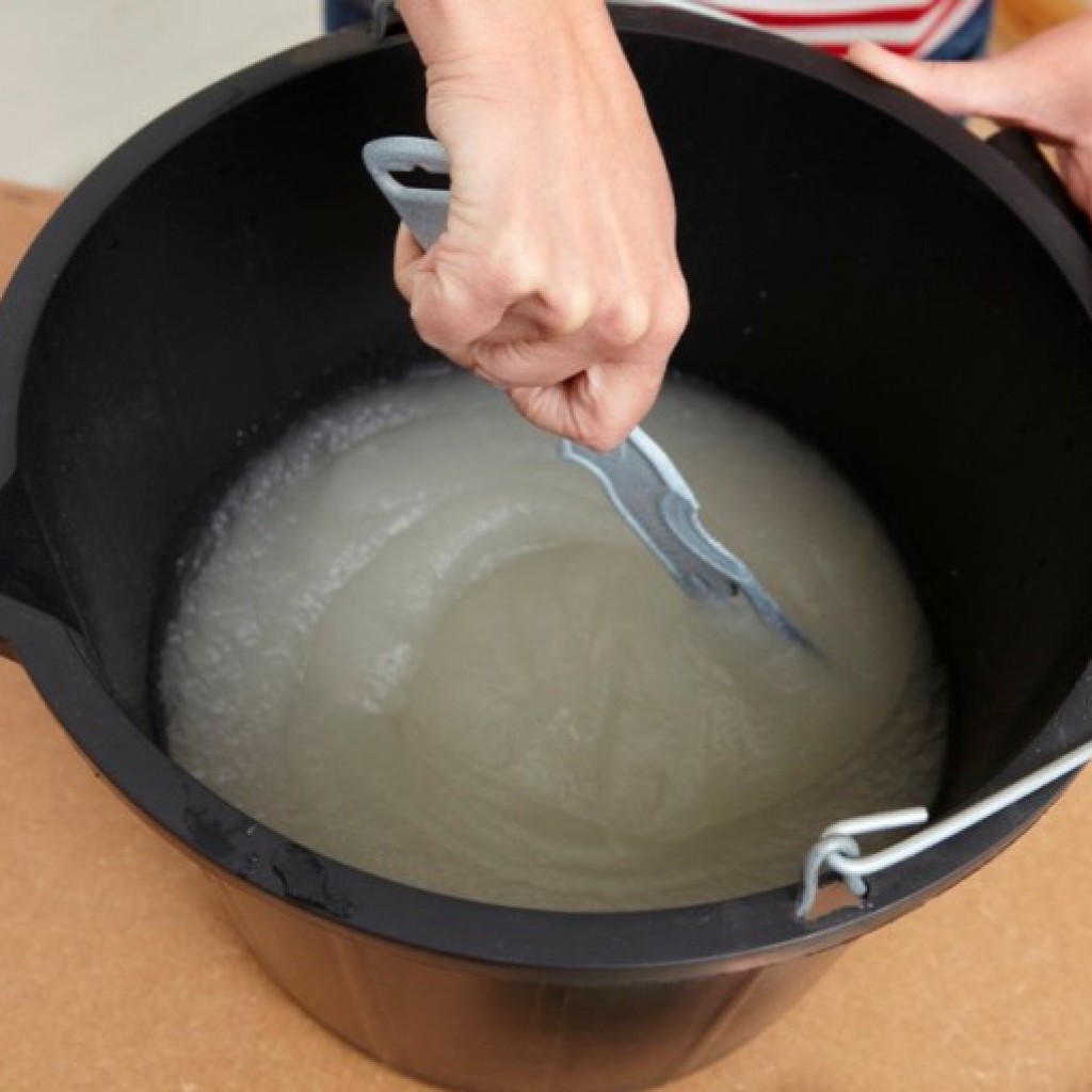 Приготовление состава лучше всего осуществлять в теплом помещении, далеко от балконов и огня. В зависимости от необходимого объема готового состава берется ведро или любая другая открытая емкость. В нее постепенно заливается клей, а к нему добавляется вода.