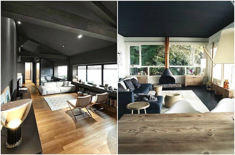 Чёрный потолок прекрасно комбинируется с деревянными балками