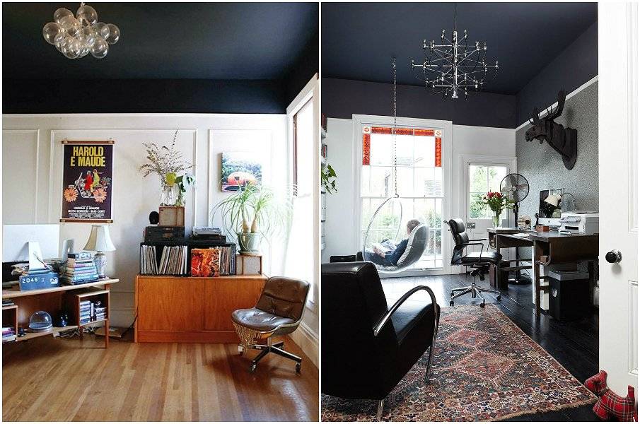 Он легко сочетается как с яркими и жизнерадостными оттенками, так и со спокойными глубокими тонами. Чёрные потолки очень часто украшают узором, напоминающим звёздное небо. Это особенно актуально для оформления интерьера спальни или детской комнаты.