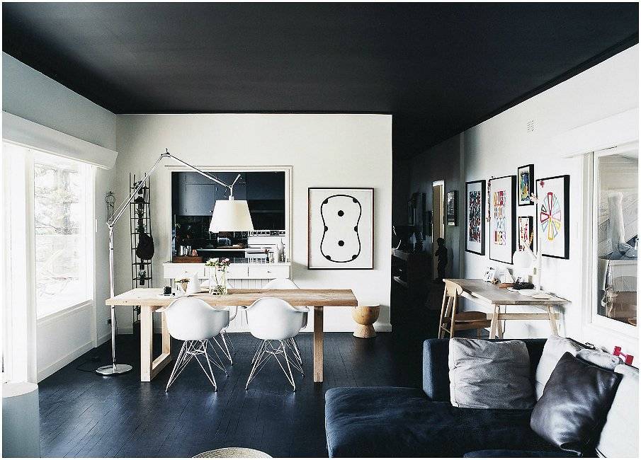 Контрастное сочетание чёрного потолка и белых стен в современных апартаментах