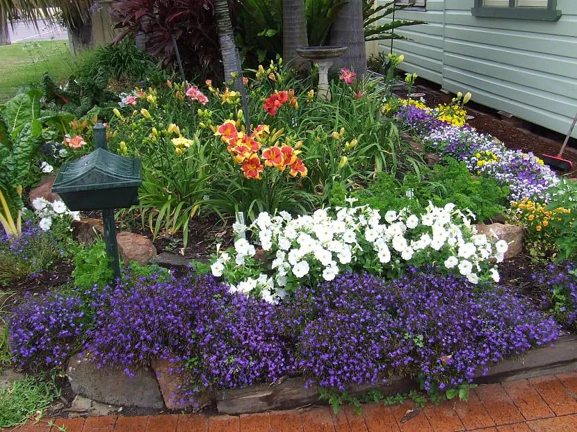 - Миксбордеры. Сочетание различных цветов в одной композиции. Располагают их обычно вдоль дома, мощеной дорожки или изгороди в виде продолговатой полосы.