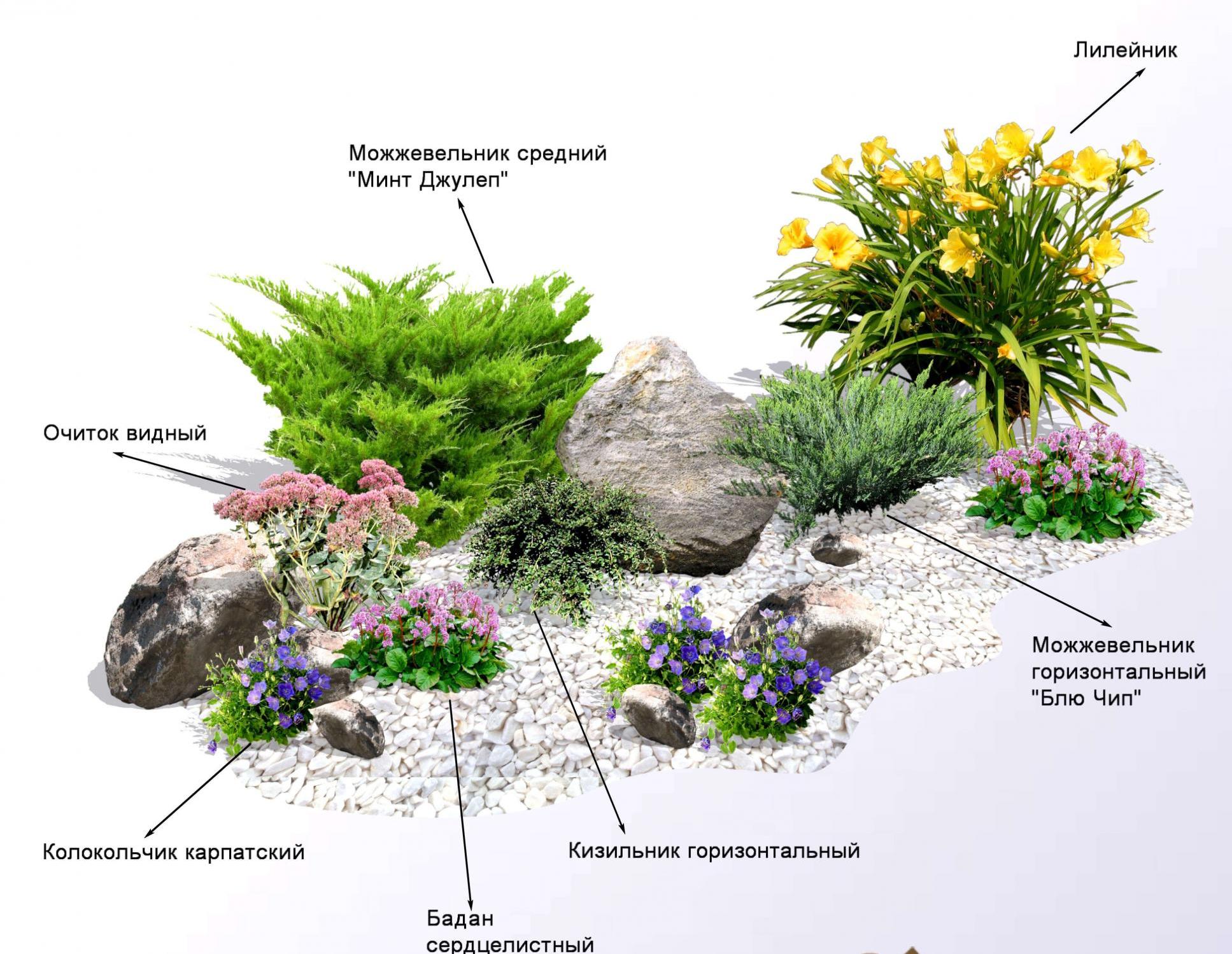 После следует разместить на клумбе красивые кустарники, ориентируясь на длину стеблей. Учитывайте тот факт, что многолетние культуры могут разрастаться.