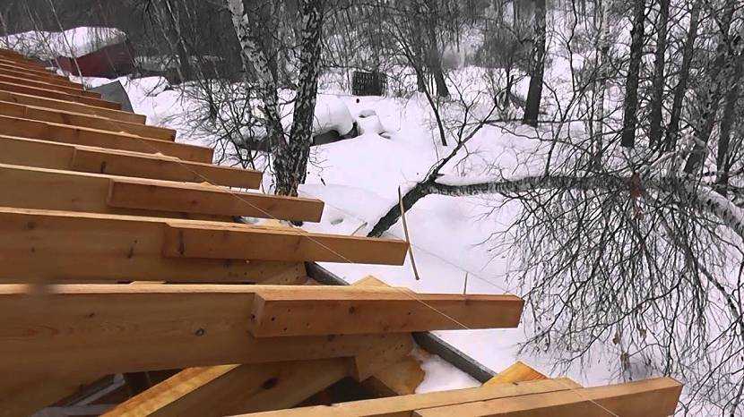 Затем между ними натягивается шнур, по которому равняются остальные кобылки. Если планируемая длина свеса больше 70 см от уровня стены, то рекомендуется соединить их сплошной деревянной рейкой — это увеличит жесткость конструкции.