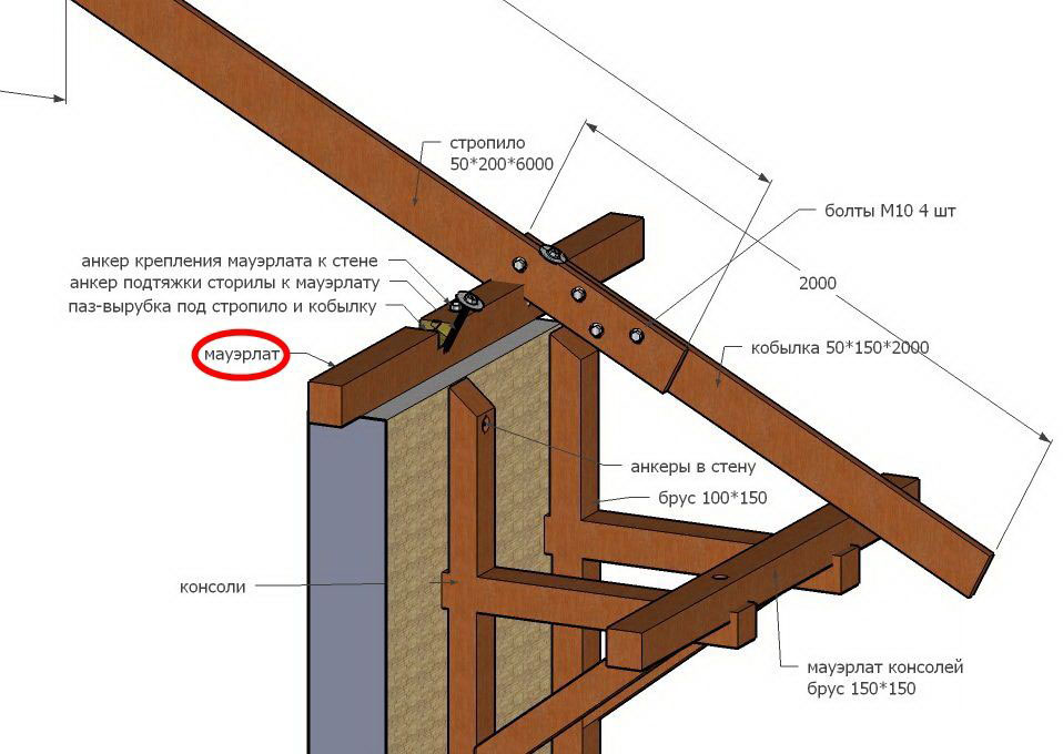 Стропильная система двускатной крыши в разрезе, способы крепления мауэрлата и стропильных ног к нему