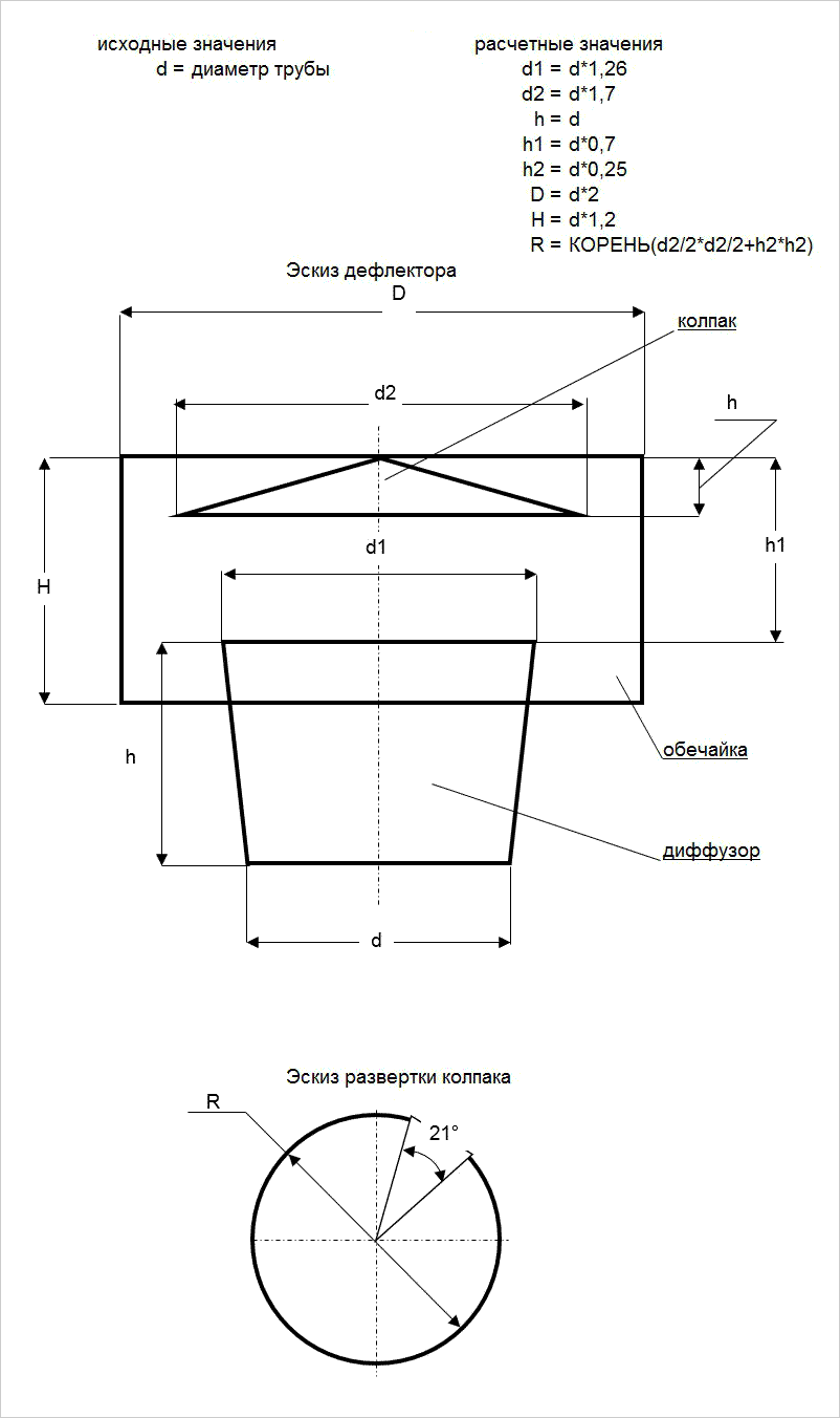Прежде чем приступить к изготовлению, важно тщательно измерить трубу дымохода. Потом нужно сделать макет зонта из картона. Чертежи выкройки: