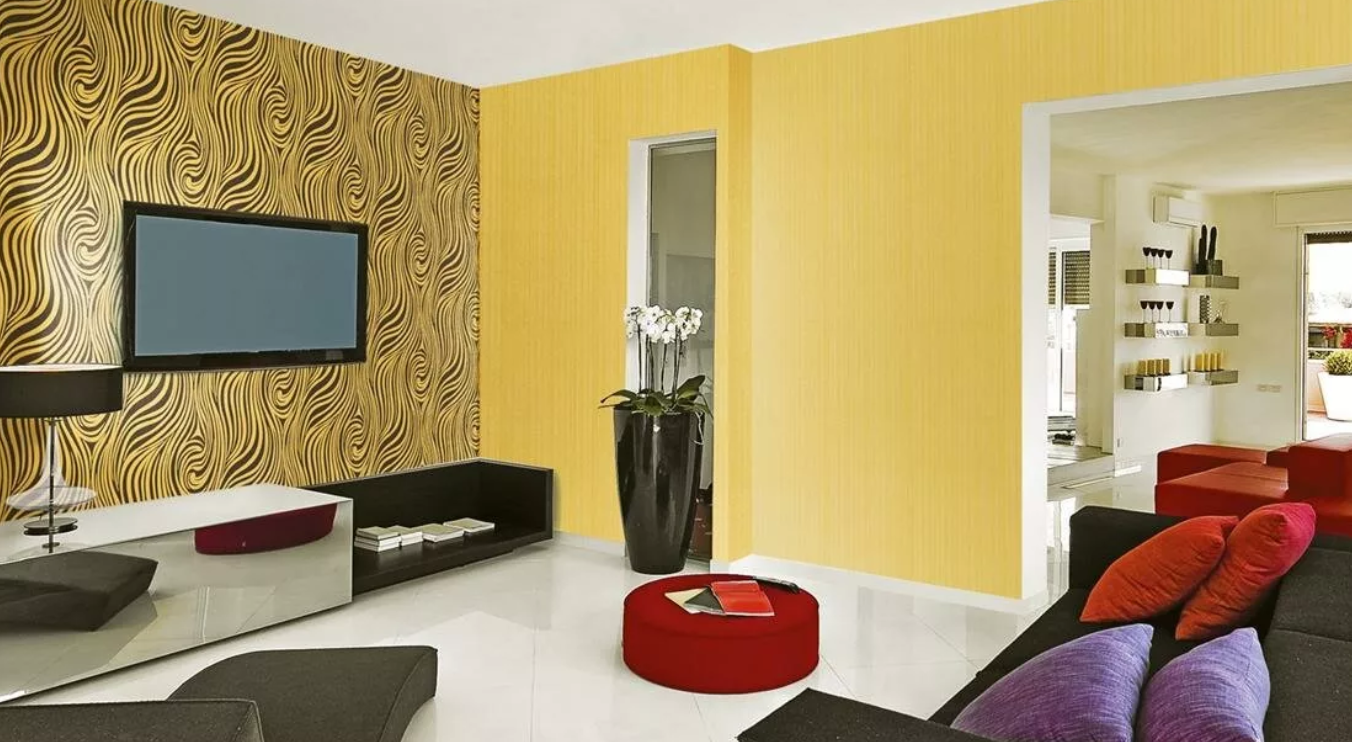 Яркие и пастельные оттенки хорошо смотрятся на гипсокартонных или каркасных перегородках в квартирах-студиях, в зале, совмещенном с кухней.