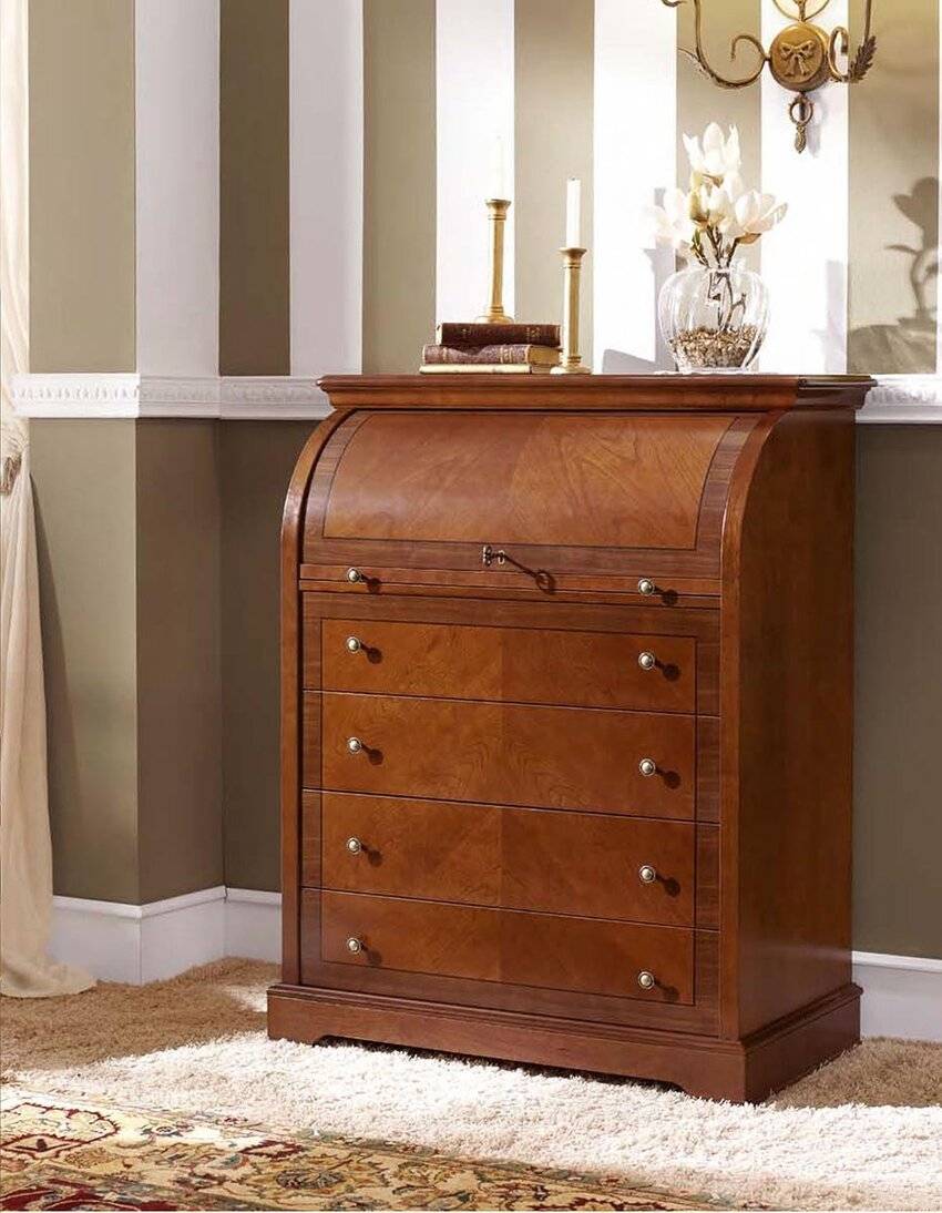 Модель, созданная в Испании, верхнюю часть занимает секретер. У него есть узкий откидной столик. В нижней части размещены обычные бельевые ящики.