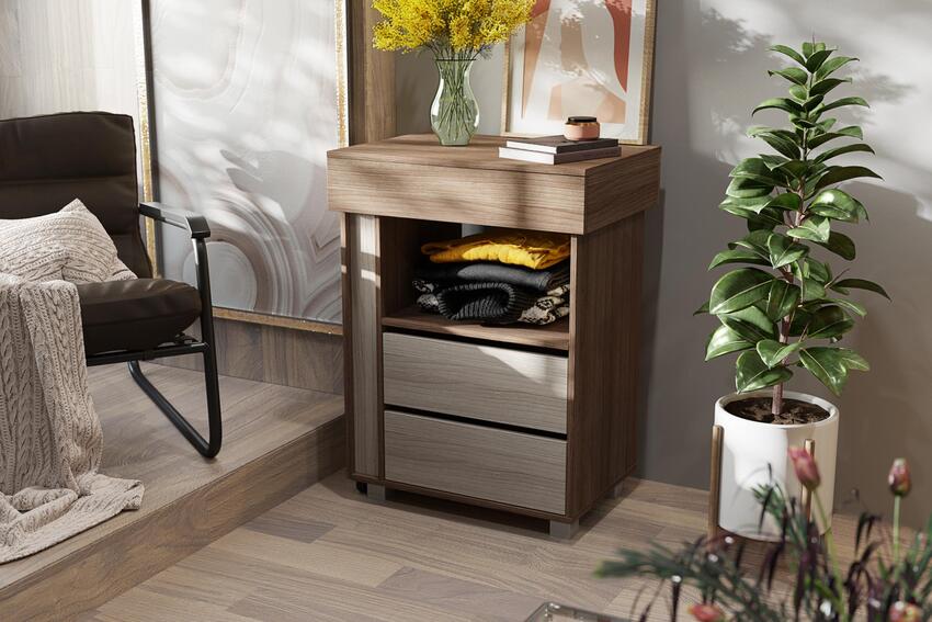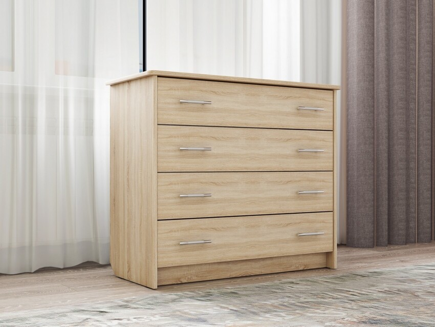 Важный момент, на который стоит обратить внимание при выборе — это объем и количество ящиков. В стандартном комоде обычно четыре выдвижных ящика