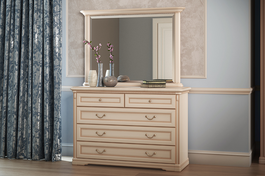 Если спальня просторная, комод может идти в комплекте с зеркалом, креслом или пуфом – это формирует единый стиль.
