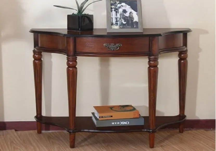 При желании приобрести экологически чистый предмет мебели стоит обратить внимание на деревянные консоли. Такие столики отлично вписываются в стиль кантри. В качестве финишной отделки нередко используются красящие составы, с помощью которых изделию можно придать любой оттенок