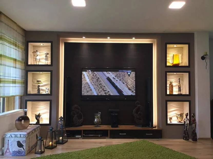 Если учесть что гипсокартон является универсальным материалом для использования различного вида отделки то необходимо определить стиль и цвет телевизора, так как стенка для телевизора, а не наоборот. Далее, необходимо определиться с освещением и местной точечной подсветкой различных декоративных элементов, картин на гипсокартоне, фотографий и комнатных растений.