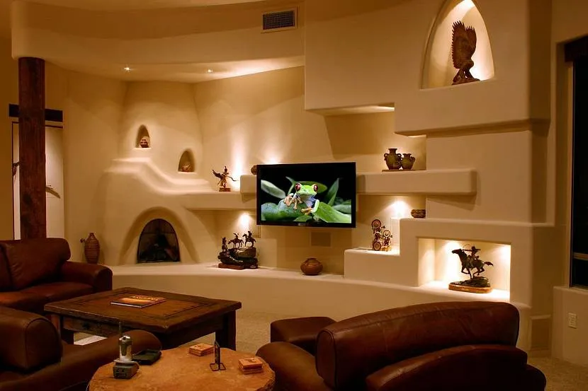 Ниша под телевизор в гостиной должна быть интересной. Возможно, применение водоэмульсионной краской, обоев, тканей и различных декоративных плиток и лепнины. Главное, чтобы стенка не конфликтовала, а дополняла интерьер гостиной комнаты.
