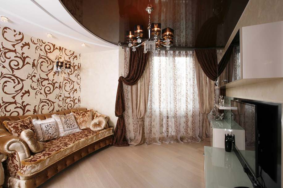 На фото глянцевая пленка шоколадного оттенка на потолке в гостиной.