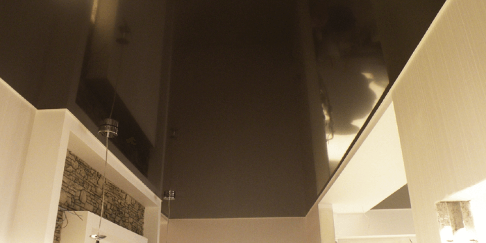 Глянец не рекомендуют использовать в помещениях, которые подвержены длительному нагреванию за счет различных приспособлений (камины, печи, кухонное оборудование). Из-за высоких температур натяжной потолок коричневый с белым потускнеет, его поверхность может покрыться рябью, что негативно скажется на интерьере в целом.