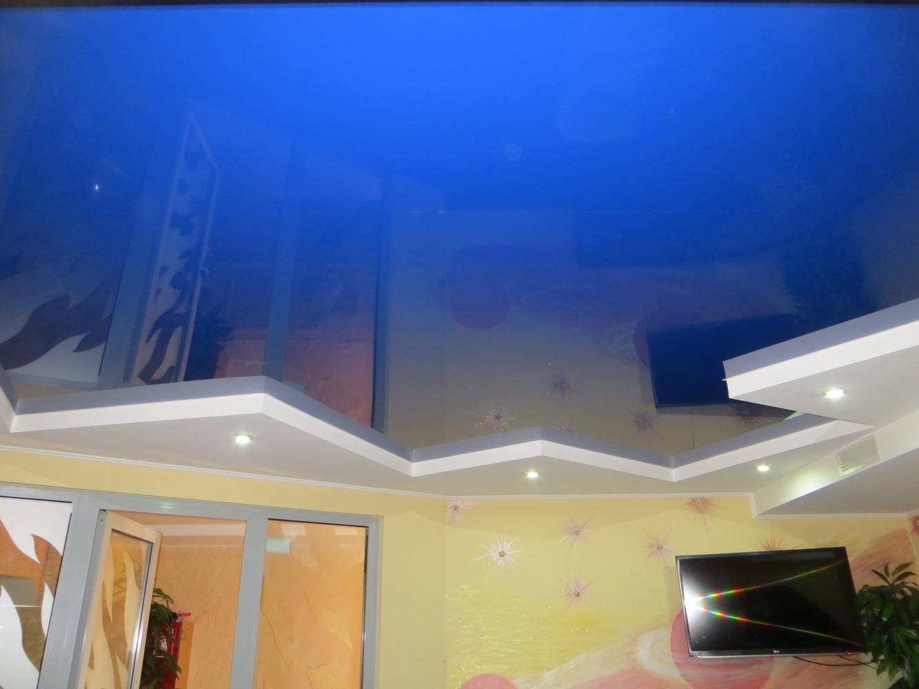 Натяжные потолки одного цвета – не редкость, но не менее популярны двухцветные полотнища (см. фото). Экспериментировать можно не только в сочетании различных цветов, но и фактур полотнищ. Только представьте, как оригинально могут смотреться матовые чёрные потолки в сочетании с белыми глянцевыми вставками. На комбинации полотен с разной фактурой стоит учитывать, что каждый материал имеет свою степень растяжения. Поэтому стыковка таких полотен должна выполняться с применением специальных стыковочных деталей. Для крепления к стенам используется алюминиевый профиль. Если есть вставка, то нужно использовать кантик и специальное крепление. Натяжные потолки, где используются два цвета, могут с успехом заменять двухуровневые натяжные потолки. Это просто находка для невысоких помещений, где двухуровневые конструкции занимают слишком много места. Такое цветное разделение потолка помогает выполнить функциональное зонирование помещения.