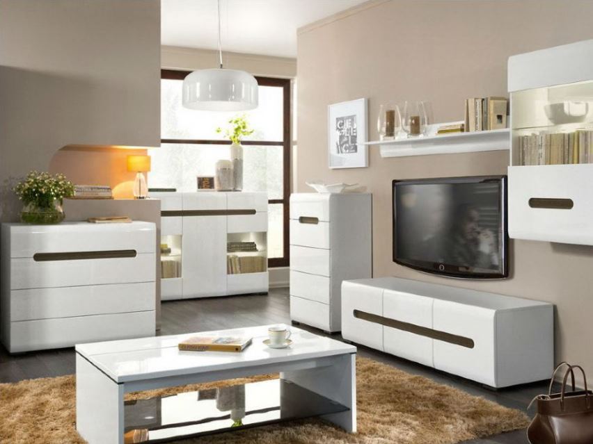 Иногда, выбирая глянцевую мебель в гостиную, заказчики и дизайнеры применяют компромиссы: оформляют в глянцевом стиле не всю гостиную, а лишь отдельные ее элементы. Например, журнальный столик, стоящий в отдалении и покрытый глянцевым покрытием, не создаст больших забот хозяевам, при этом будет прекрасно смотреться в комплекте с глянцевой поверхностью шкафа. Некоторые для большей прочности делают верхнюю часть стенки для гостиной глянцевой, а нижнюю – матовой, такие примеры можно просмотреть на фото.