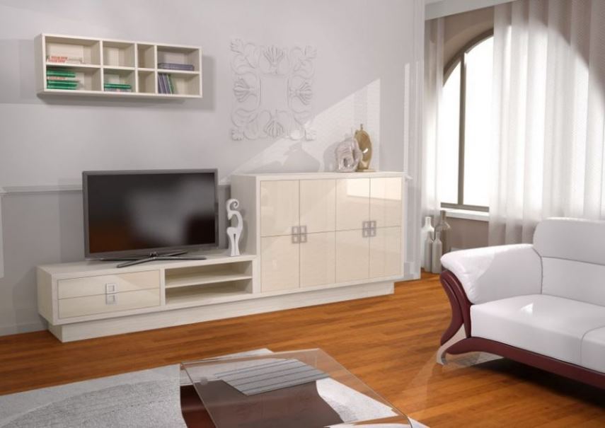Для современной гостиной выполненной в стиле минимализм чаще всего выбирают длинные тумбы и навесные консоли. Они помогают аккуратно расположить бытовую технику и различную мелочь. Поверхность такой мебели имеет большое количество глянцевых деталей.