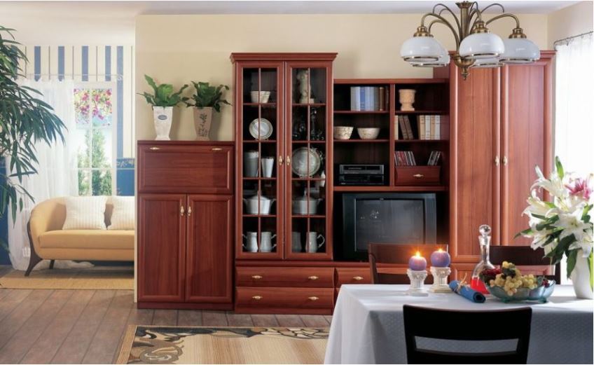 Шкафы в гостиную сконструированы большей частью для малогабаритных квартир, поэтому основное назначение — максимальная вместительность и функциональность. Они дополнительно комплектуются секциями под телевизор, аудио технику, открытыми секциям.