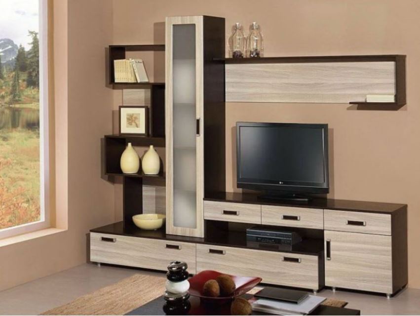 Благодаря богатому ассортименту, стенку можно подобрать и для гостиной в малогабаритной квартире. Для этого стоит лишь приобрести мебель с небольшими по высоте и ширине полками, шкафами. Для такой квартиры подойдёт, как угловая мебель с одностворчатым шкафом, так и «горка» с небольшими, но вместительными полками.