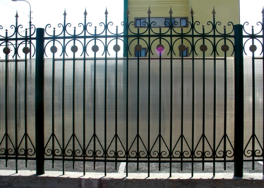 Стоимость кованого забора, обшитого поликарбонатными листами, является довольно демократичной. Специалисты рекомендуют использовать такое сочетание в том случае, если участок расположен в черте города. Использование поликарбоната не перегружает конструкцию, поэтому готовая ограда смотрится лаконично.