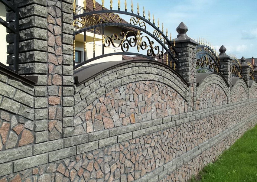 Эффектный и эксклюзивный внешний вид имеет забор с полукруглым проемом. Распространенным вариантом является комбинация кирпичных пролетов и столбов с коваными навершиями. Пример такой конструкции представлен на фото.