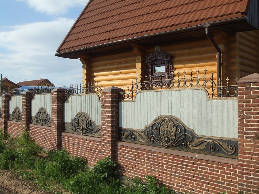Ковка — один из самых дорогостоящих способов обработки металла. Ограждение территории загородного дома надёжным и эксклюзивным забором из металлических прутьев может здорово ударить по карману. Украсить сплошной забор из кирпича, камня или бетона помогут имеющиеся в продаже на строительных рынках декоративные кованые узоры на забор в виде разнообразных фигурок животных, растительных орнаментов, геометрических фигур, пик или завитушек, расположенные по периметру всего ограждения. Великолепно дополнят монументальную ограду кованые ворота или металлические накладки на колонны забора.