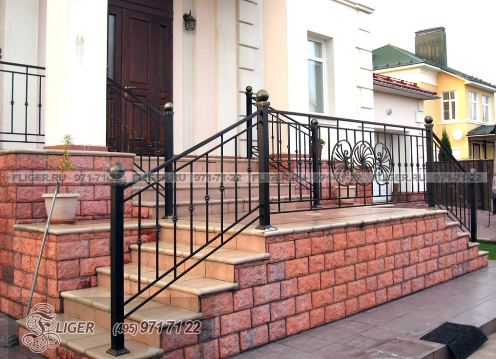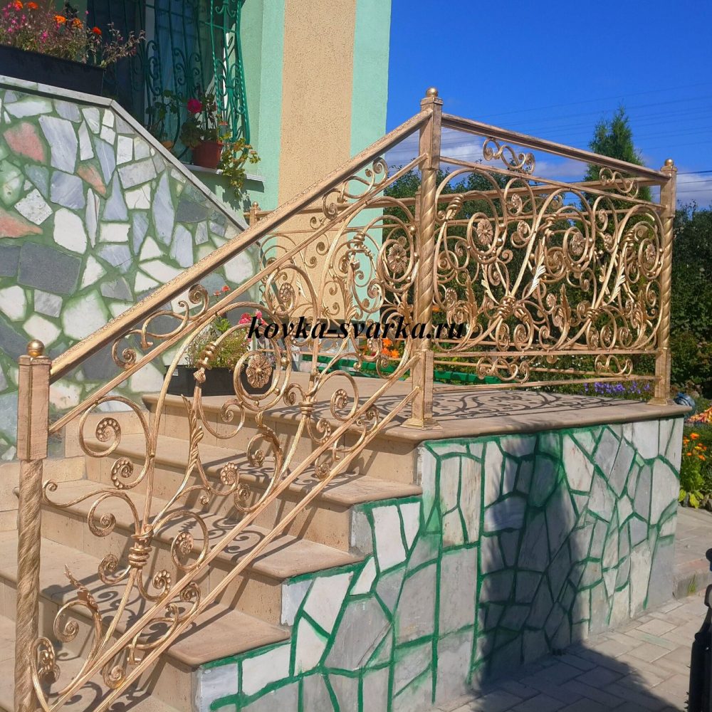 Дизайн экстерьера богато обставленных особняков и коттеджей рекомендуется декорировать коваными перилами. Художественные изделия прекрасно дополняют роскошную окружающую обстановку.