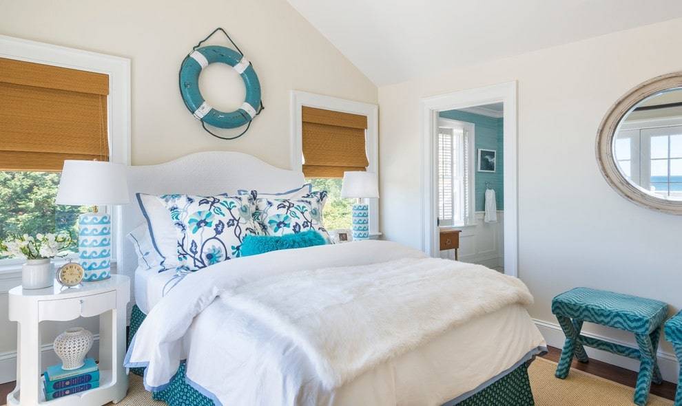 Морской стиль не может быть представлен без нескольких украшений или текстиля в данной тематике, которые помогают придать дому желаемое расслабляющее настроение. Белые, кремовые или серые стены упростят комнату, идеально соответствуя стилю. Расширьте диапазон цветов несколькими выцветшими оттенками синего и серого, сопоставляя с белым. Иногда, при необходимости, следует добавить немного граната или красного. Также будут работать оттенки бирюзы, относящиеся к цвету южных морей. Украсьте комнату коралловыми аксессуарами.