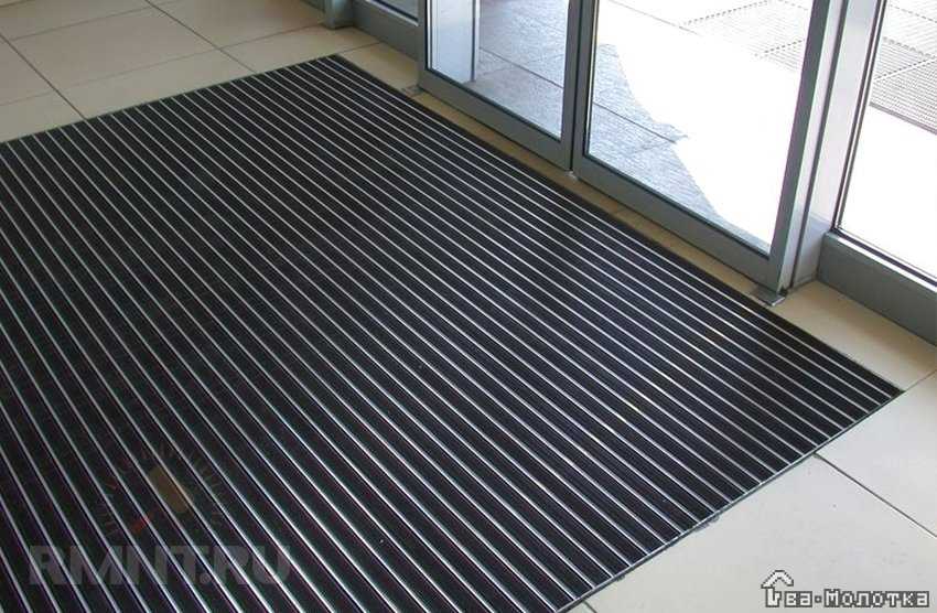 Как ухаживать за напольным покрытием у дверей? Снаружи, обычно, располагают резиновый половик, который можно очистить с помощью моющих средств. Изделие с резиновыми ворсинками хорошо задерживает грязь и очищает подошву обуви, однако, нуждается в постоянной мойке. Половики с ячеистой структурой подошву сапог и туфель не очистят, зато уход за ними не доставит труда.