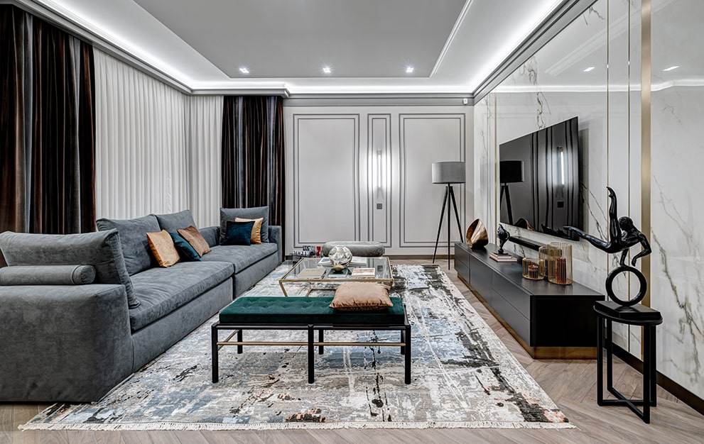 Ковер большого размера в интерьере гостиной