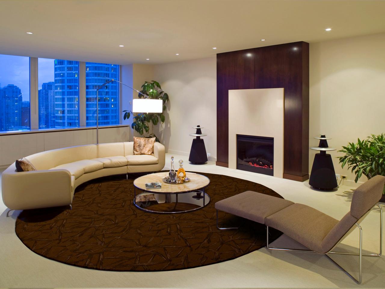 В гостиной часто располагают круглый коврик с большим ворсом.