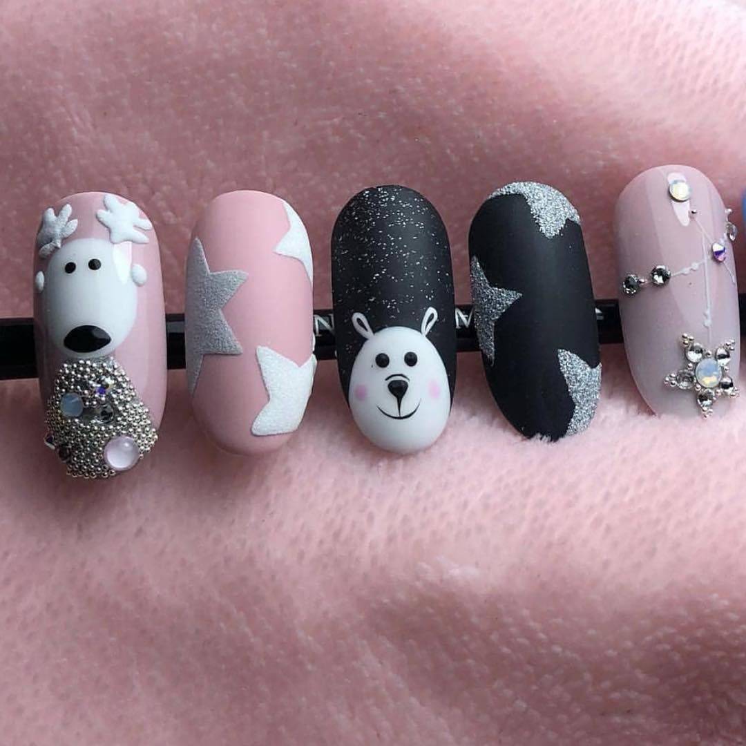 Большая часть мастеров маникюра используют акриловую пудру для создания зимнего нейл-арта. В основном это орнаменты определенной тематики, которые невозможно выполнить без данного приспособления. Пудра служит средством для создания выпуклостей определенных элементов рисунка (снежинки, шарф и шапка медвежонка и многие другие рисунки). Зачастую используется акриловая пудра нежных постельных и белых цветов.