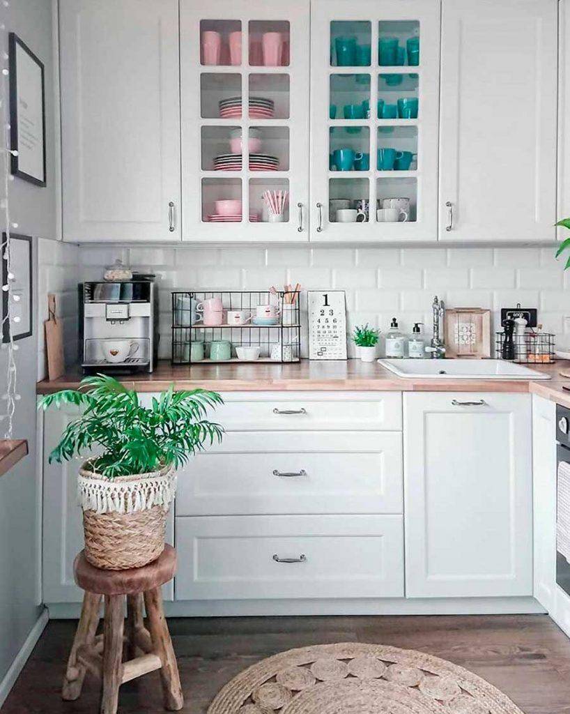 Деревянная столешница отлично смотрится с белым или бежевым гарнитуром. Наиболее актуальные стили для оформления — скандинавский, прованс, кантри. Такой интерьер получается очень атмосферным.