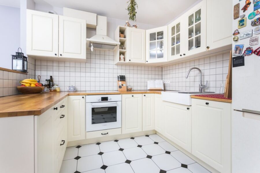 Часто на полу кухни можно увидеть керамогранит, имитирующий дерево. Белая кухня с деревянной столешницей в интерьере будет смотреться прекрасно. То же касается и мрамора.