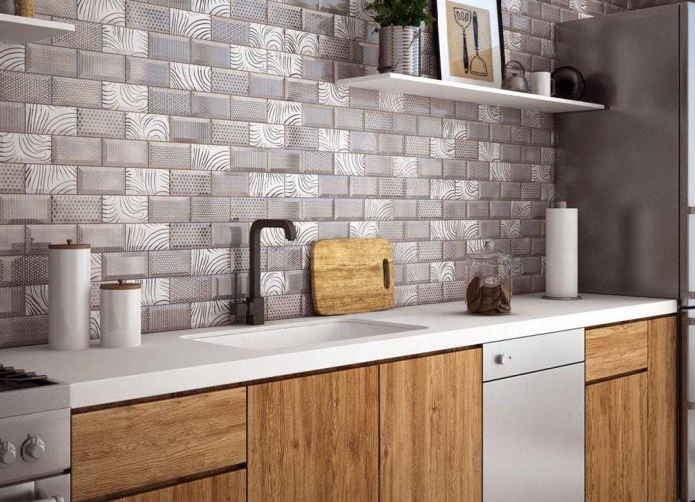 Текстура и узоры на плитках также важны. Кафель с четкими геометрическими узорами можно выбрать для одноцветных кухонных фасадов. Деревянная мебель в сочетании с четкой текстурой плитки, имитирующей, например, бетон, не являются наилучшей комбинацией. Этот тип отделки будет лучше на просторных кухнях в стиле лофт.