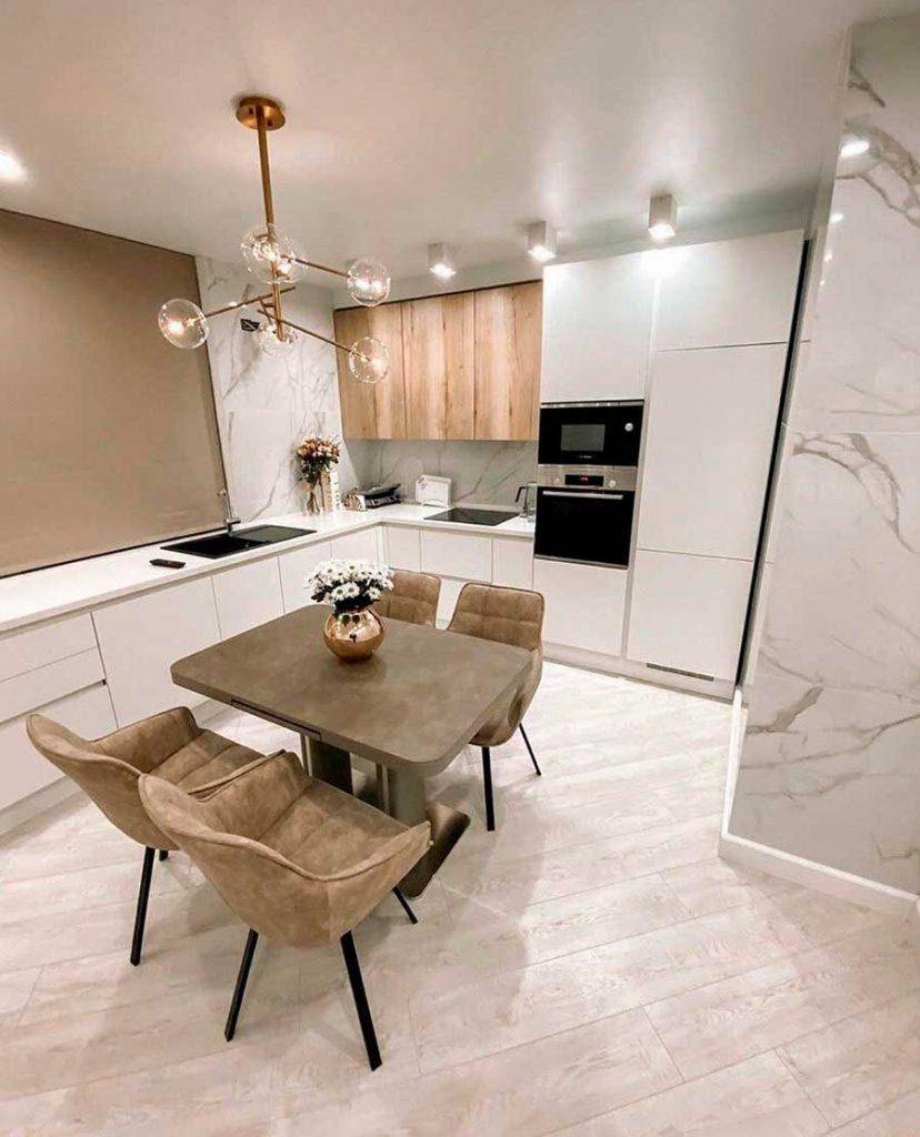 Если площадь кухни более 13 м2, дизайнеры советуют обратить внимание именно на этот тип расстановки. Он сделает помещение стильным и необычным