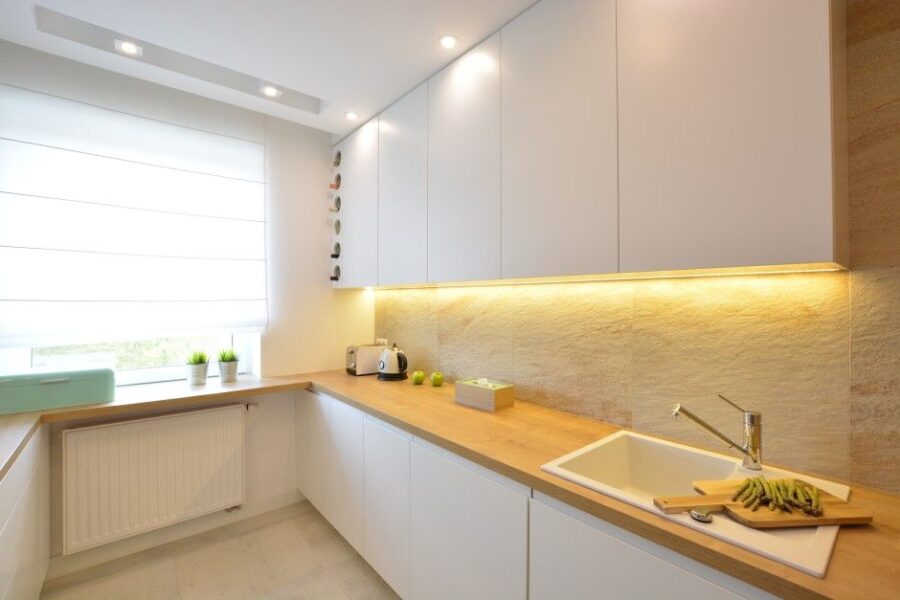 Расширить пространство небольшой площади кухни можно, используя подсветку фартука, выделения рабочей и обеденной зоны отдельными системами освещения.