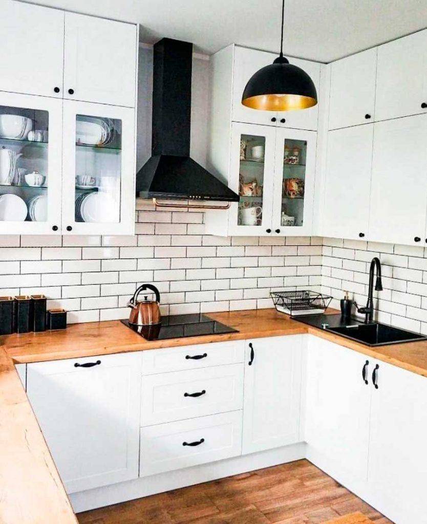 Отличный вариант для компактной кухни – фартук из белой плитки в сочетании с белым гарнитуром и деревянной столешницей. Выглядит фартук довольно интересно за счет формы плитки.