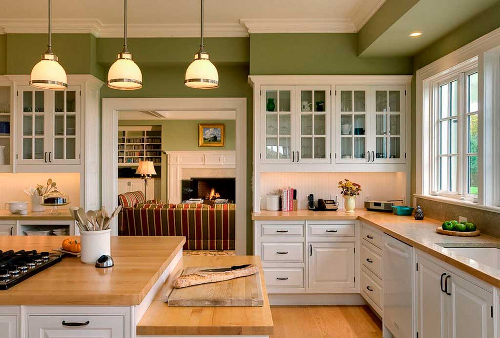 Белый цвет сочетается с разными оттенками зелёного: травяным, бирюзовым, цветами хвои и другими. Оттенок подбирают в зависимости от основного тона: с ярко-белым лучше сочетаются светлые яркие цвета, с гарнитуром под светлое дерево – более мягкие.