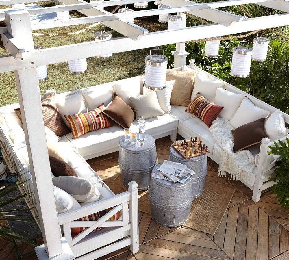 Арочные навесы (арки, перголы). Богато увитые зеленью, цветами, такие элементы декора придадут воздушность, очарование и чувственность патио. Добавят умиротворения декоративные думочки на стульях и скамьях.