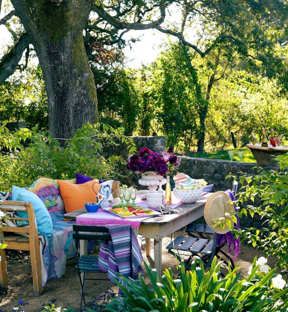 Деревенский. Для небольшой дачи этот стиль является беспроигрышным вариантом. Достаточно устроить площадку с деревянным полом и навесом, поставить стол, лавку, добавить соответствующий текстиль – и уютный уголок готов. При желании можно установить печку.
