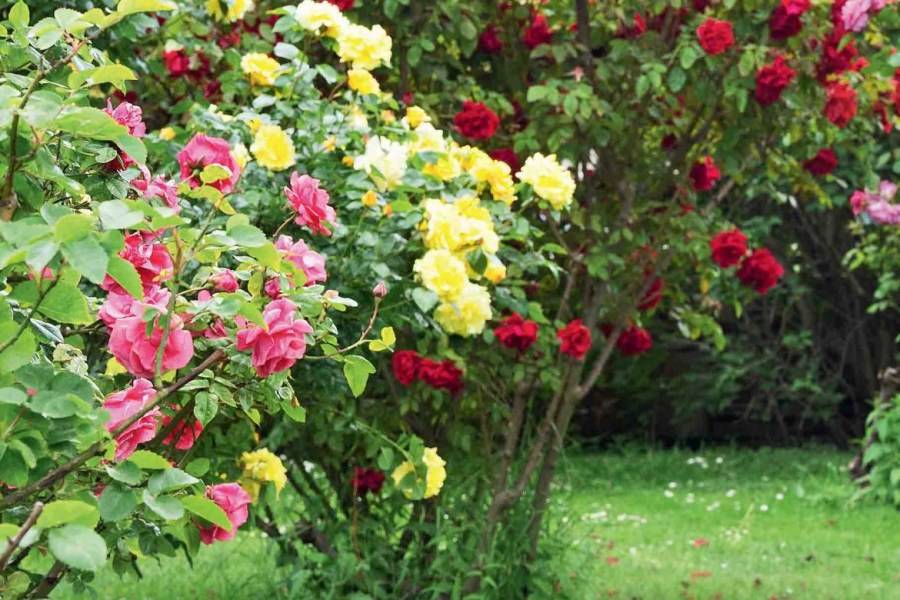 - шток-роза «Пленифлора» с густомахровыми венчиками желтых, лососево-розовых и красно-пурпурных цветов («Pleniflora» это не роза, а гигантская мальва, которая обильно цветет на солнечных и увлаженных участках сада с середины лета до первых холодов);