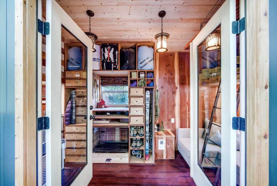 Неудобные предметы маленькой мебели, такие как мягкие скамейки, выдающие себя за диван, не очень привлекательны. Именно поэтому нам нравится этот великолепный дом площадью 300 квадратных футов под названием Royal Pioneer от компании Hand Crafted Movement, расположенной в Портленде, штат Орегон. Компания спроектировала гостиную так, чтобы в ней поместился полноразмерный спальный диван от IKEA. Чтобы сделать просмотр сериалов еще более уютным, комната оборудована электрическим камином, дополненным 40-дюймовым телевизором Smart TV. Массив встроенных настенных систем хранения создает уголки для декоративных аксессуаров и книг.