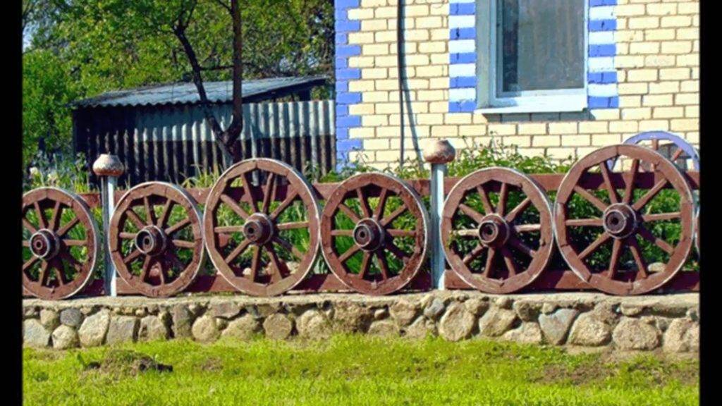 Очень популярны заборчики из отслуживших свой век автомобильных шин. Они вкапываются в почву в виде бордюра или укладываются плашмя одна на другую в 3 – 4 ряда. Применив второй способ, можно совместить забор с клумбой, засыпав в верхние покрышки землю и посадив в них растительность.