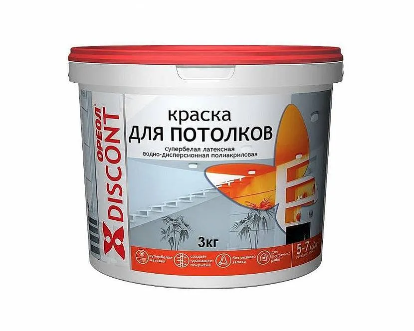 Российский бренд выпускает недорогие водоэмульсионные краски для потолков. В состав отделок добавляют антисептические вещества, которые предупреждают появление плесени. У бюджетной эмали низкая укрываемость, поэтому для получения идеально ровной поверхности придется нанести 3 слоя.